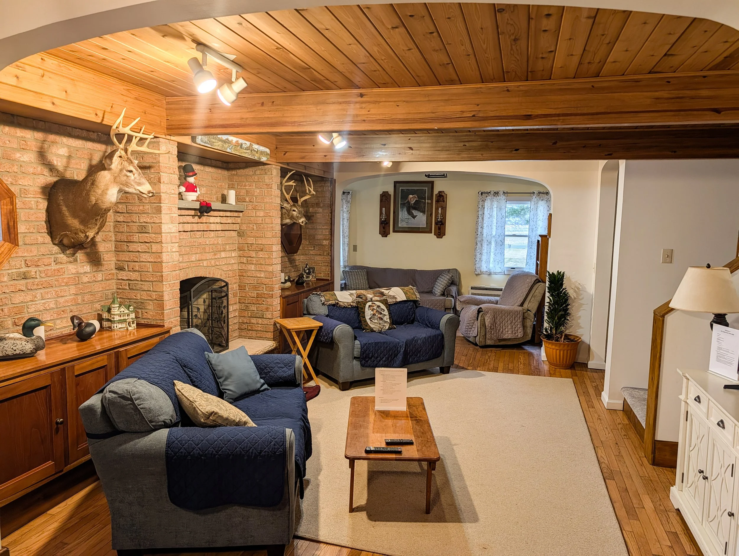 Our lodge sleeps up to 10 with 2 1/2 baths, full kitchen, washer/dryer and outdoor fireplace area. Centrally  located close to most of our leases makes our comfortable lodge convenient for your hunting adventures.